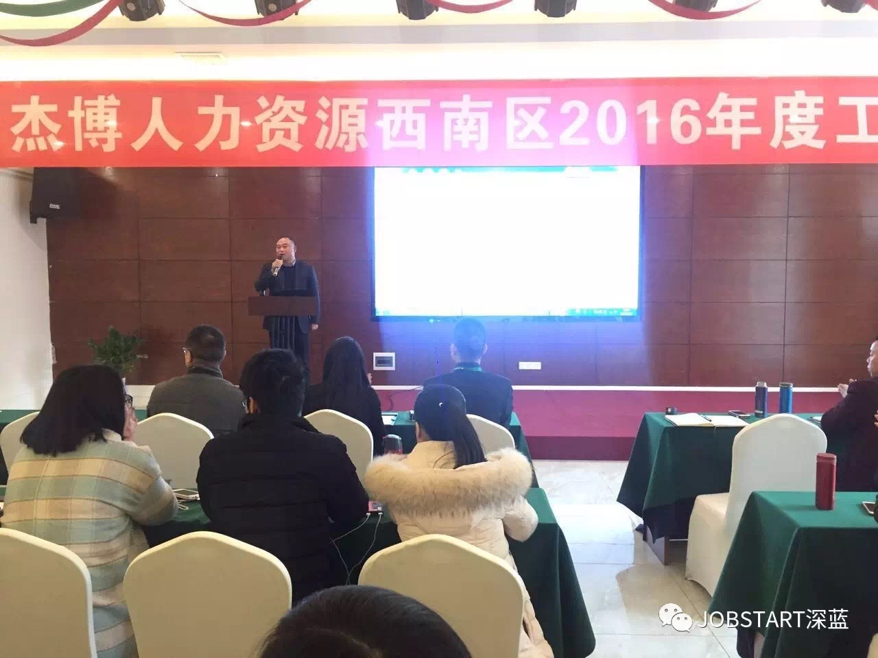 會議由杰博人力資源重慶分公司朱曉玲主持本次會議,王晶燁總代表公司領(lǐng)導(dǎo)致辭,其次邱永軍總對重慶、成都地區(qū)分別作了2016年工作總結(jié)以及2017年工作計劃,最后是各個部門負(fù)責(zé)人也分別在會議上作了工作報告及計劃。