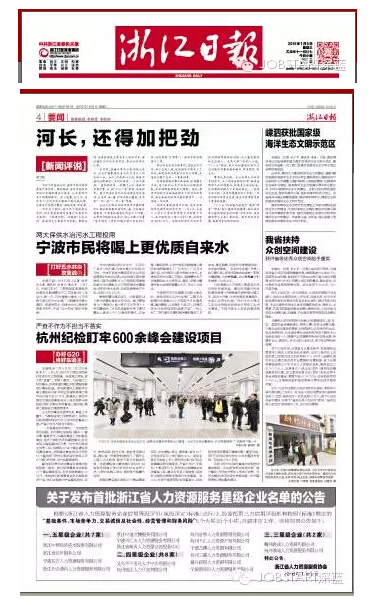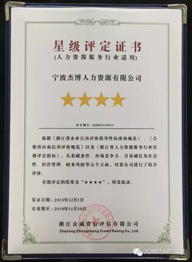 2016年1月6日,在杭州召開的浙江省人力資源服務(wù)協(xié)會(huì)第一屆第三次會(huì)員大會(huì)典禮上,包括寧波杰博人力資源有限公司在內(nèi)的17家人力資源企業(yè)獲評(píng)首批“浙江省人力資源服務(wù)星級(jí)企業(yè)”殊榮,其中,杰博人力資源獲評(píng)“四星級(jí)”企業(yè)。
